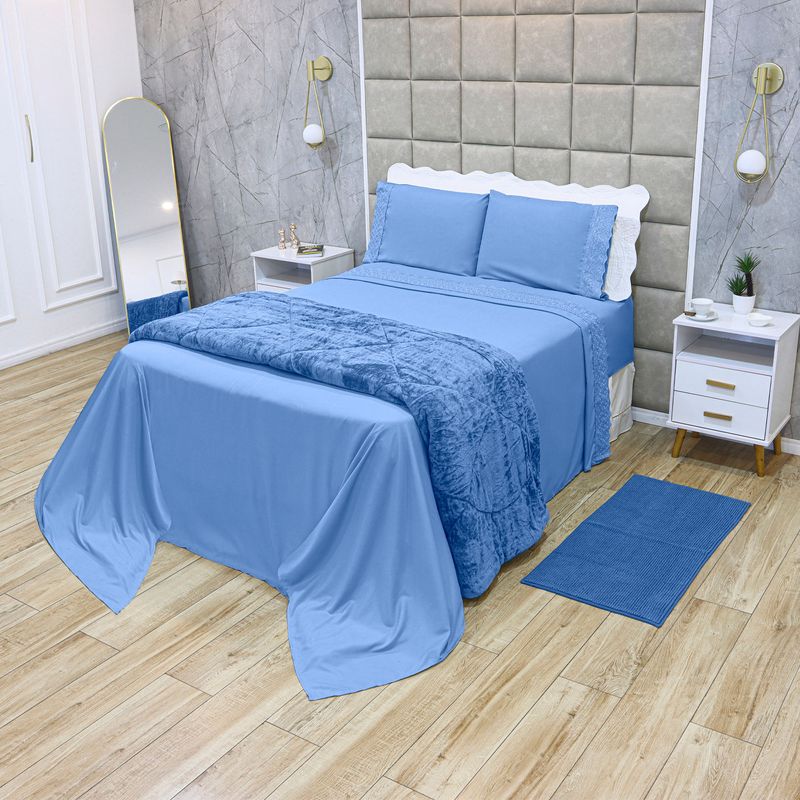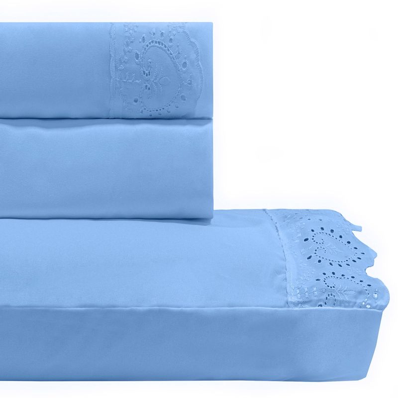 JOGO DE CAMA SOLTEIRO BORDADO INGLÊS - CORAÇÕES ABERTOS AZUL CLARO